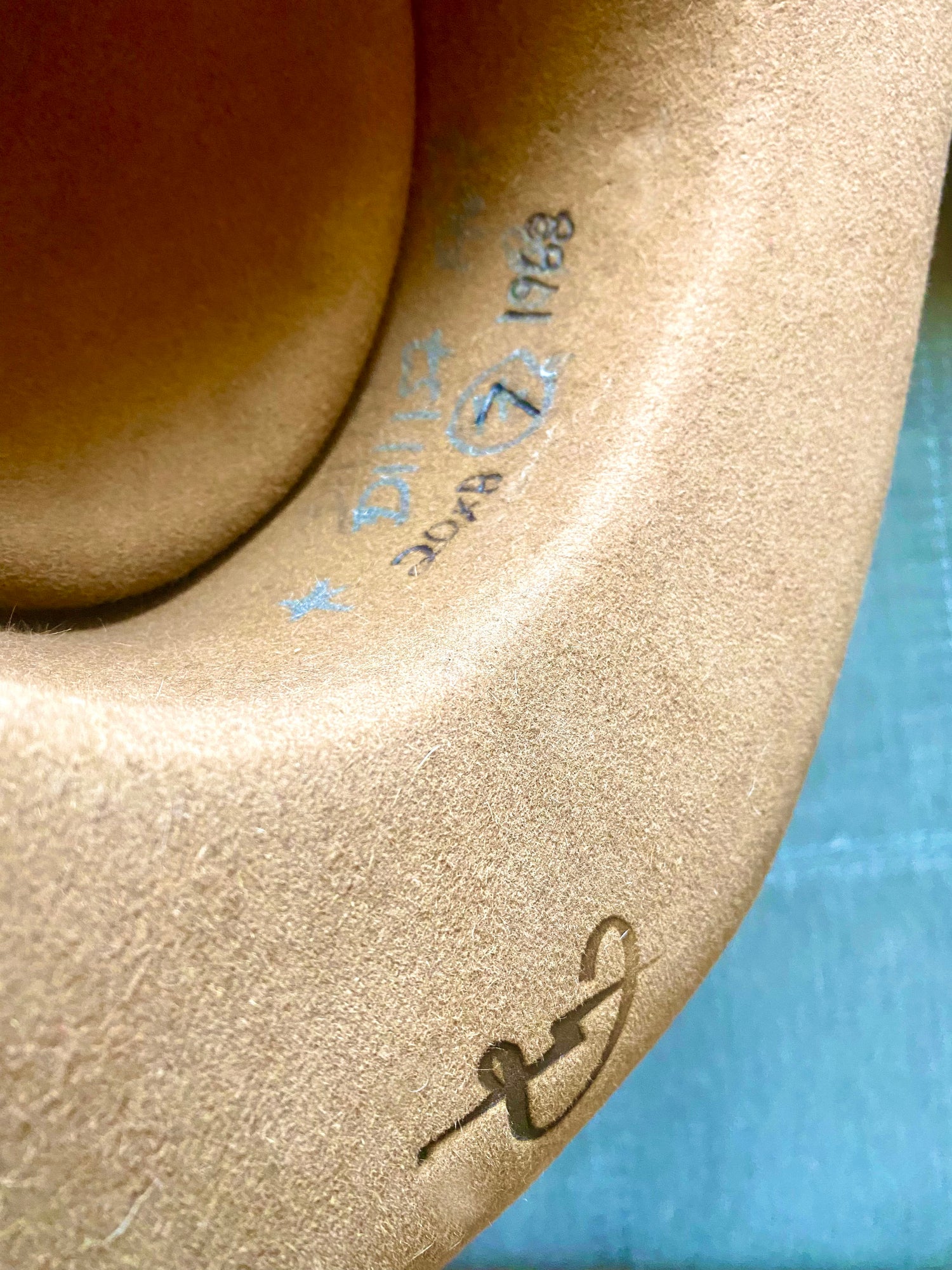 D69 Hats are handmade by artist Ken Goldstein - one hat at a time. The hats are made from either vintage fur, pulled from historic pelts, or repurposed from an existing hat. D69 Hats do not come with hatliners, hat bands, or any accoutrements common in retail Western style hats. D69 Hats are not fancy hats. These are raw with an unfinished quality because once you start wearing yours, it'll finish itself. The D69 logo is burned into the hat, as are details like size and approximated quality of fur. Source material is researched and original production dates estimated and branded in the hat.