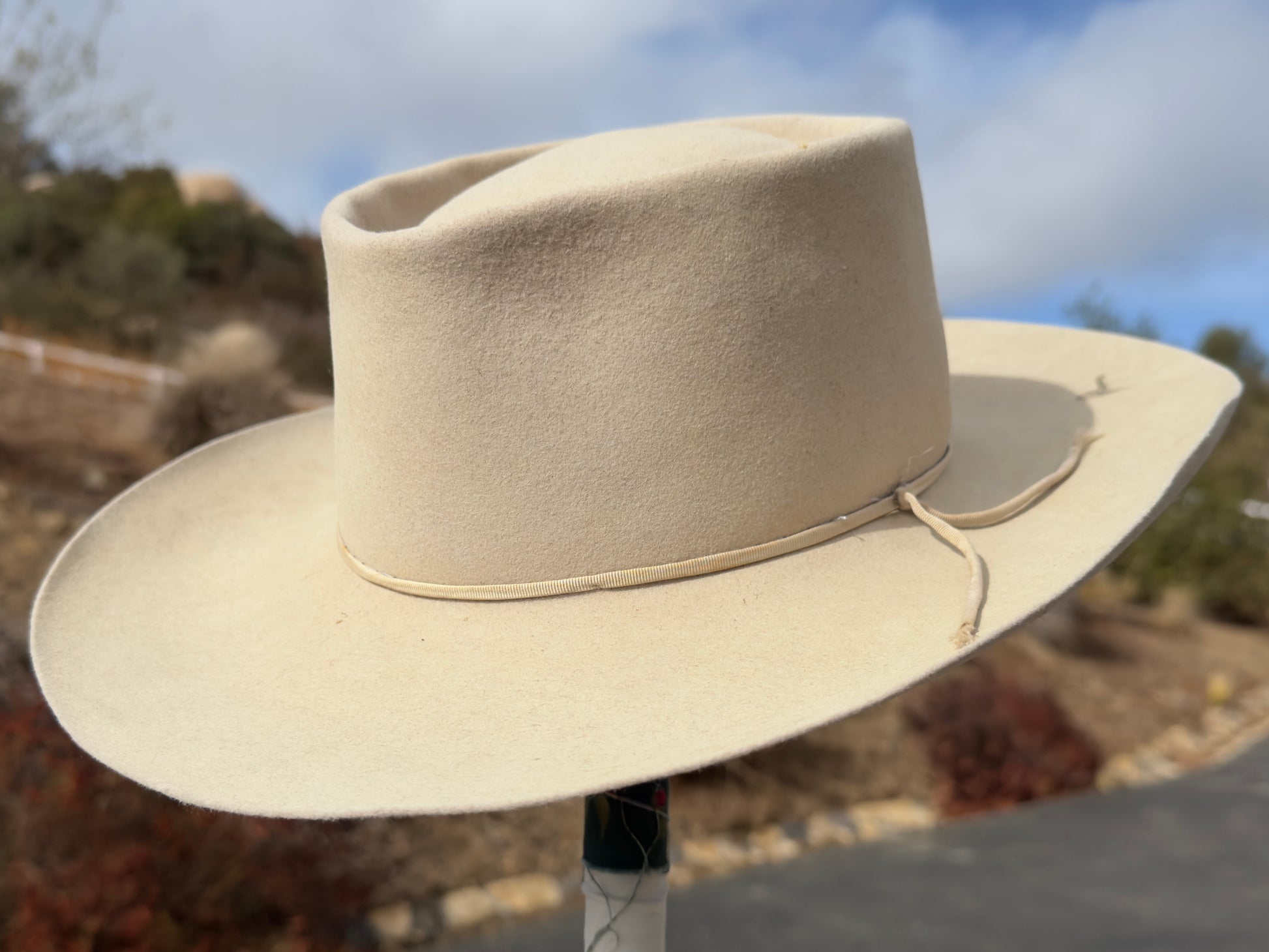 D69 Hats are handmade by artist Ken Goldstein - one hat at a time. The hats are made from either vintage fur, pulled from historic pelts, or repurposed from an existing hat. D69 Hats do not come with hatliners, hat bands, or any accoutrements common in retail Western style hats. D69 Hats are not fancy hats. These a raw with an unfinished quality because once you start wearing yours, it'll finish itself. The D69 logo is burned into the hat, as are details like size and approximated quality of fur. Source material is researched and original production dates estimated.